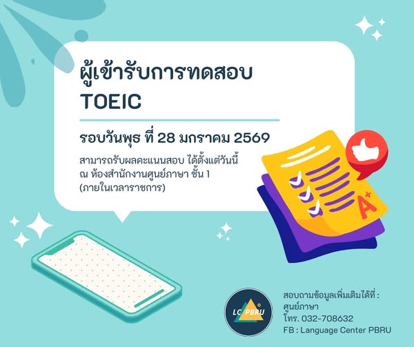 ประกาศ ผู้เข้ารับการทดสอบ TOEIC รอบวันพุธ ที่ 28 มกราคม พ.ศ. 2569 ที่ผ่านมา