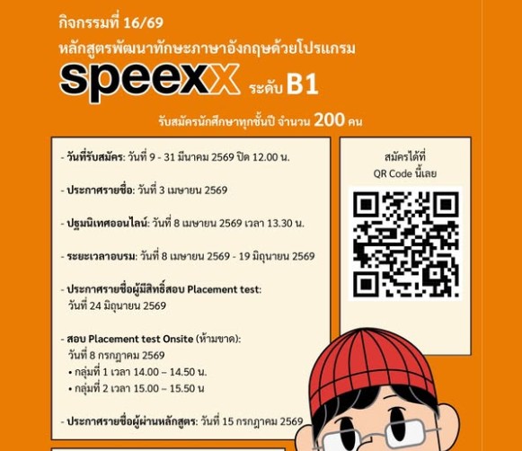 กิจกรรมใหม่ เปิดรับสมัครแล้ว กิจกรรมที่ 16/2569 หลักสูตรพัฒนาทักษะภาษาอังกฤษด้วยโปรแกรม SPEEXX ระดับ B1