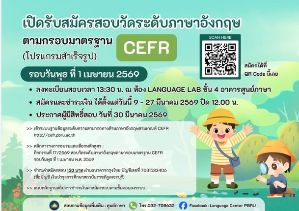 เปิดรับสมัครกิจกรรมที่ 17/2569 สอบวัดระดับภาษาอังกฤษตามกรอบมาตรฐาน CEFR รอบวันพุธ ที่ 1 เมษายน พ.ศ. 2569