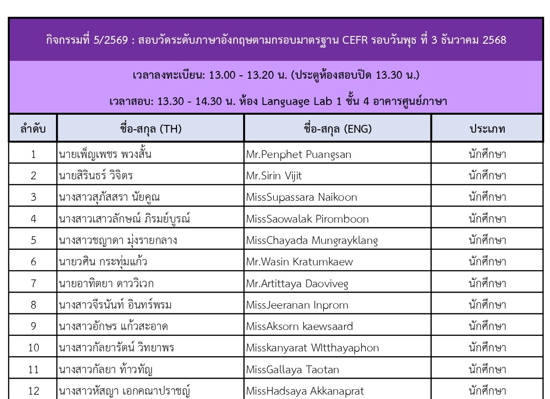 ประกาศรายชื่อ ผู้สมัครสอบวัดระดับภาษาอังกฤษตามกรอบมาตรฐาน CEFR