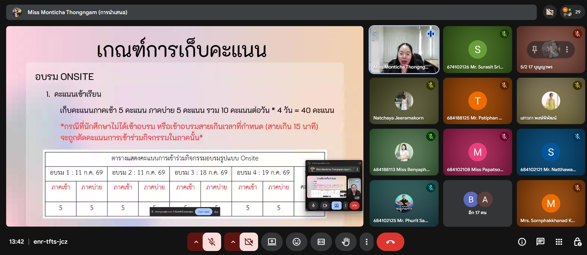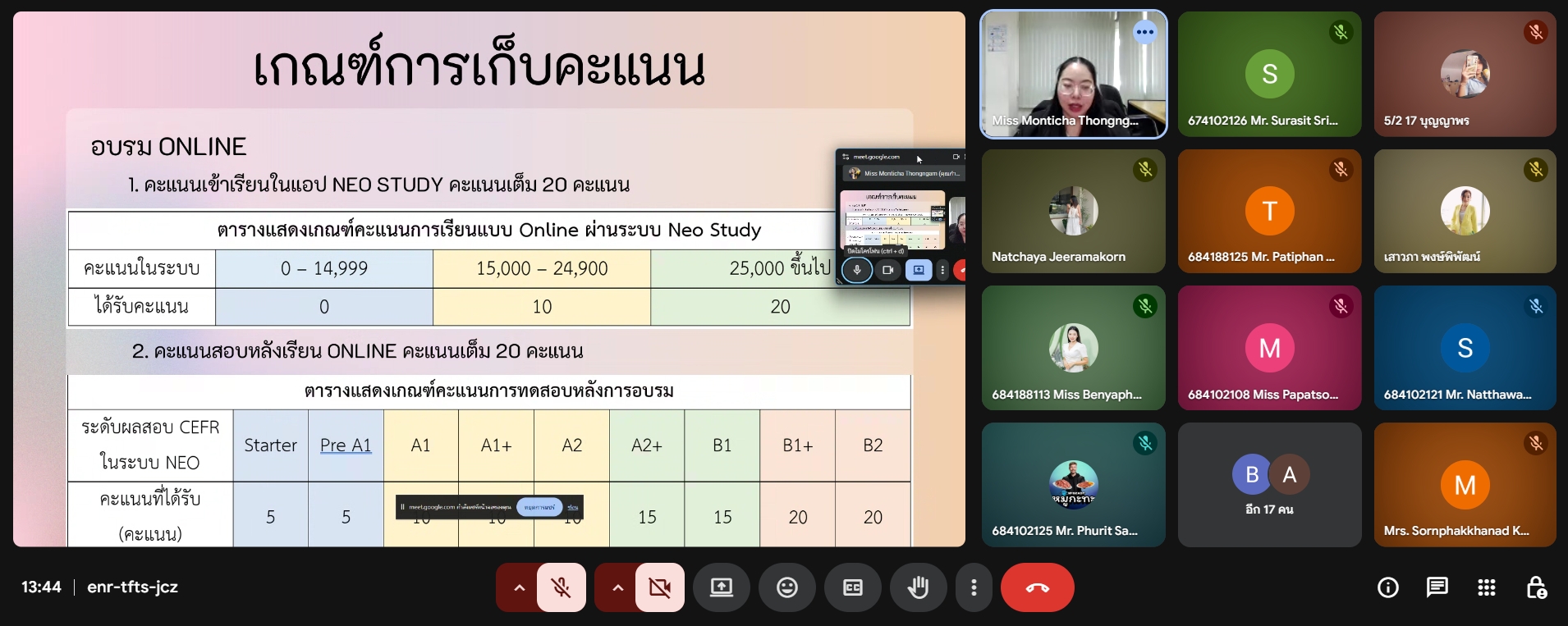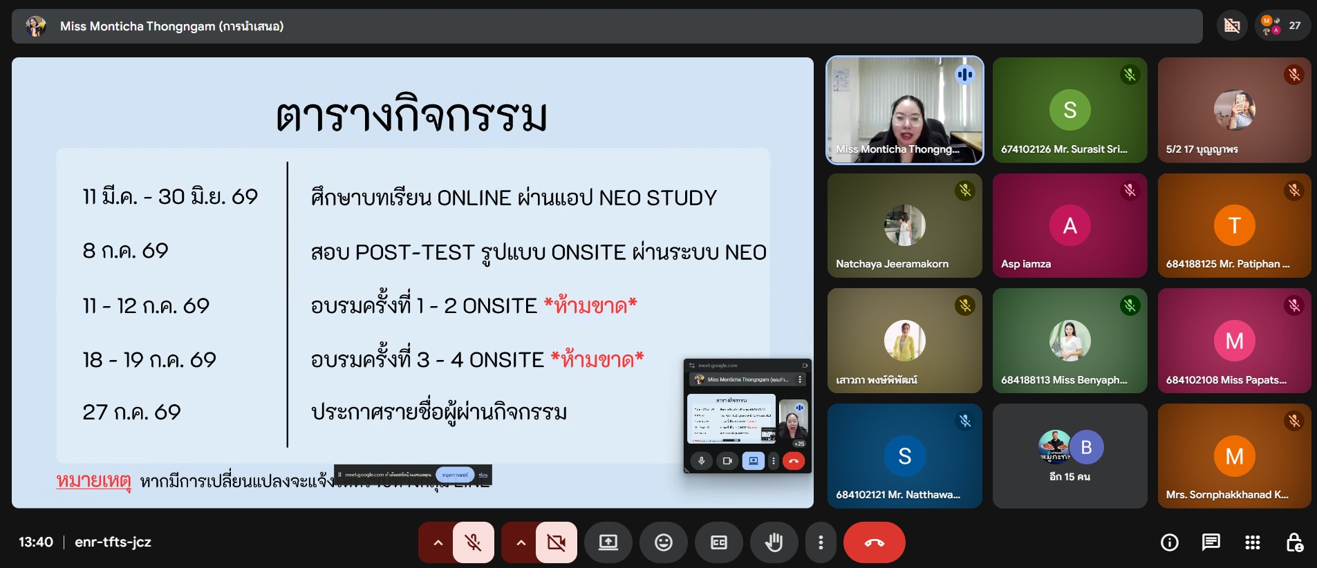 ในวันพุธ ที่ 11 มีนาคม พ.ศ.   2569 รูปแบบออนไลน์ผ่านระบบ Google Meet โดยมี นางสาวมนต์ธิชา ทองงาม นักวิชาการศึกษา พร้อมด้วยทีมงานศูนย์ภาษา ร่วมชี้แจงรายละเอียดของหลักสูตร อาทิ กำหนดการกิจกรรม เกณฑ์การเก็บคะแนนของหลักสูตร รวมถึงเกณฑ์การผ่านกิจกรรม เพื่อให้นักศึกษาเข้าใจแนวทางการเรียนรู้และสามารถเข้าร่วมอบรมได้อย่างมีประสิทธิภาพ