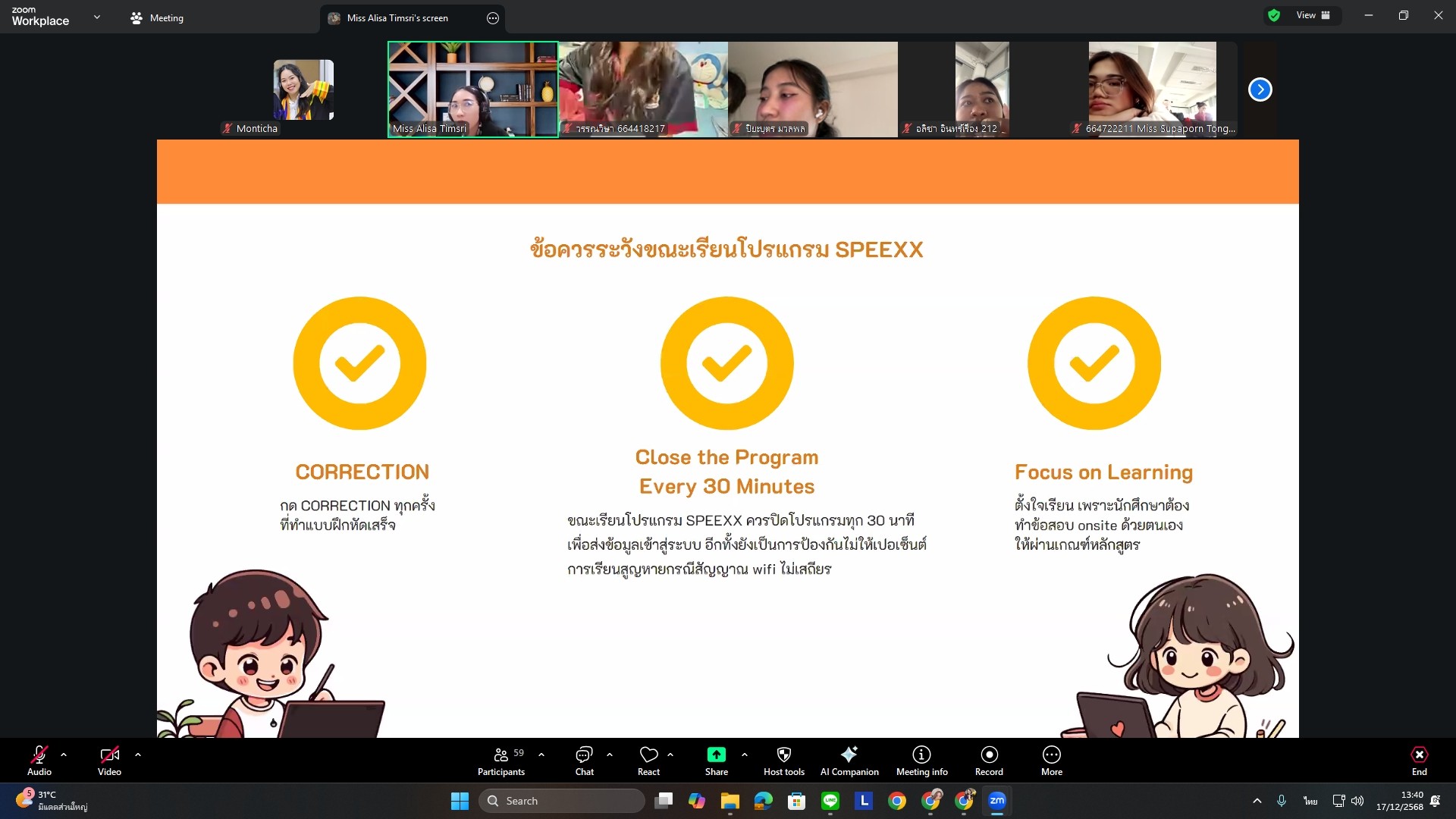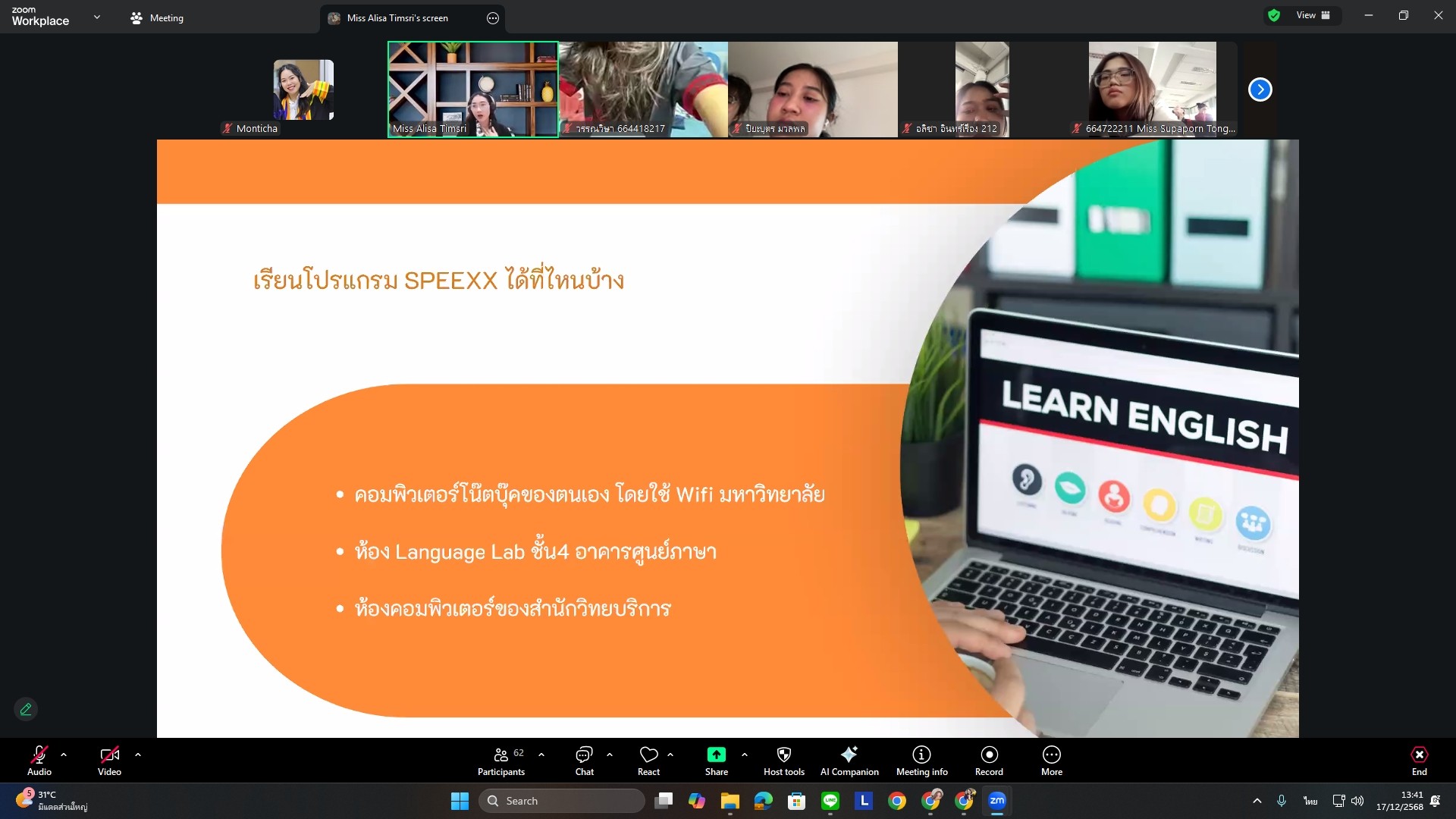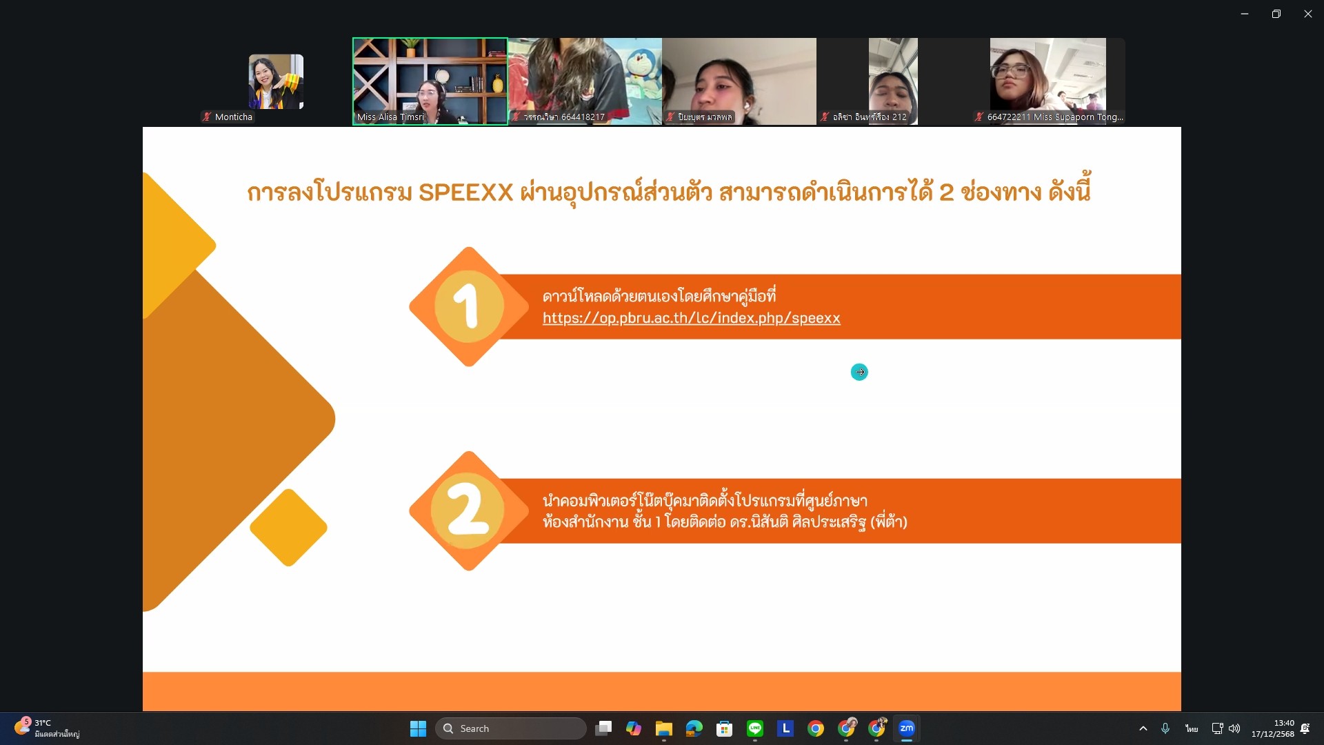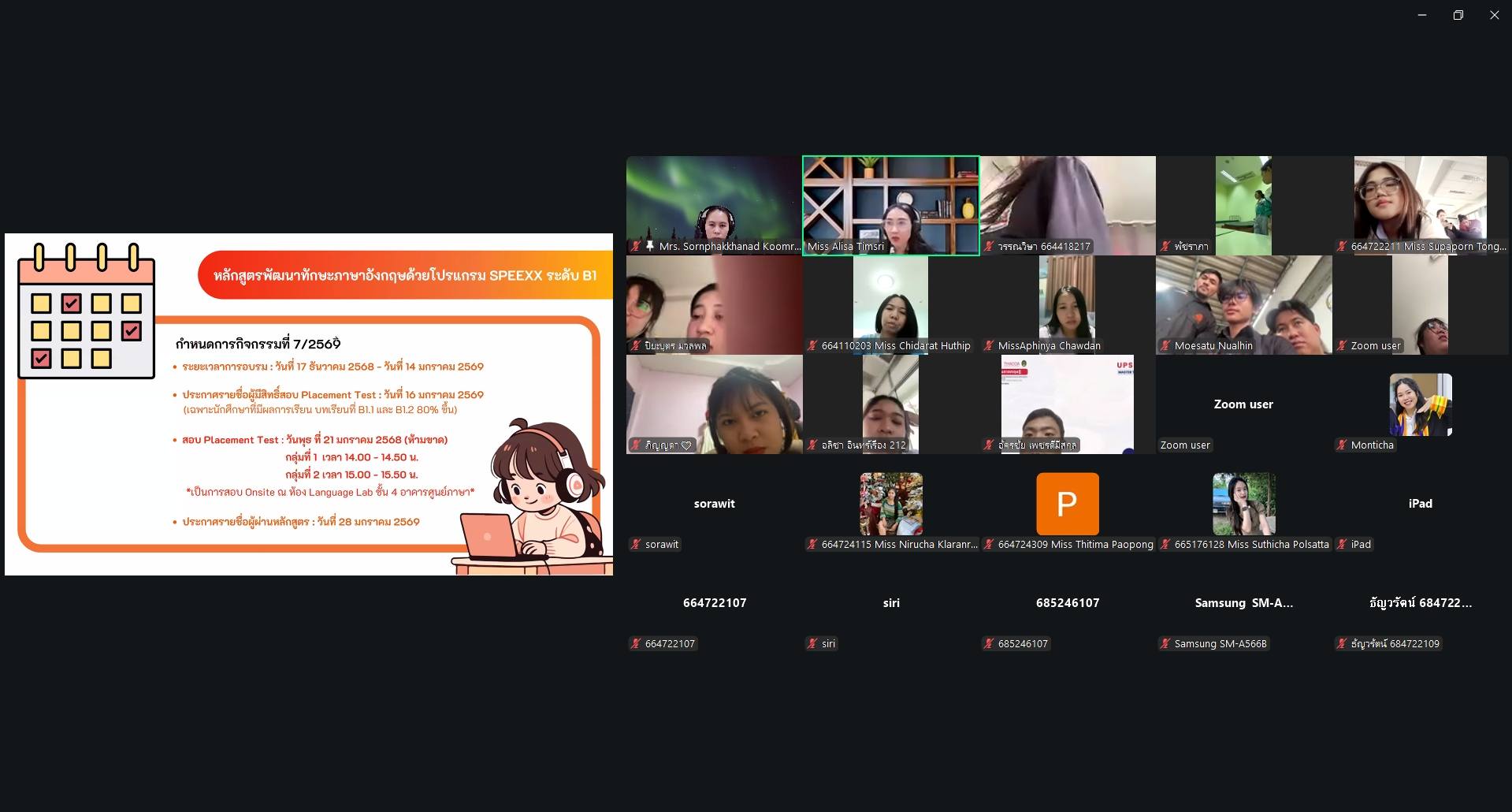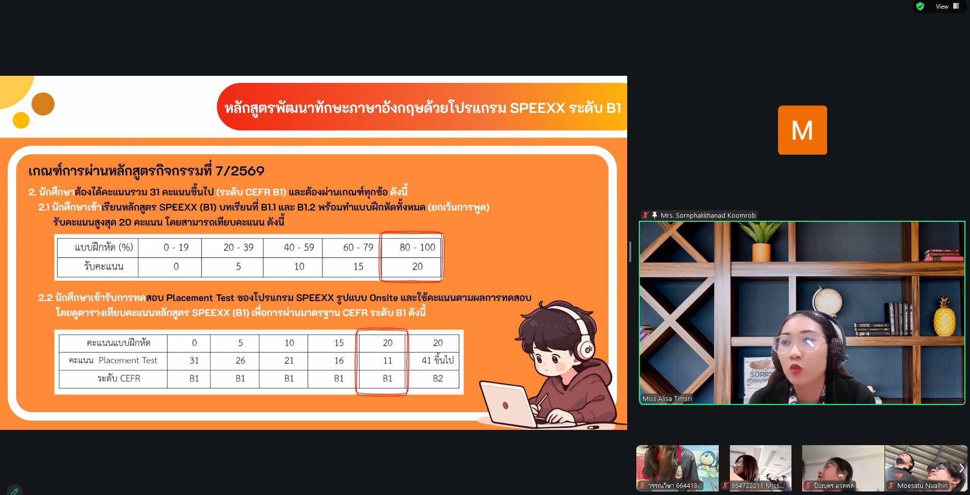 กิจกรรมดังกล่าวจัดขึ้นเมื่อวันพุธ ที่ 5 ธันวาคม 2568 เวลา 13.30 – 14.30 น. ในรูปแบบออนไลน์ผ่าน Zoom Meeting โดยมี นางสาวอลิสา ทิมศรี นักวิชาการศึกษา พร้อมด้วยทีมงานศูนย์ภาษา ร่วมชี้แจงรายละเอียดของหลักสูตร อาทิ วัตถุประสงค์ของการจัดกิจกรรม ลักษณะและรูปแบบกิจกรรมการเรียนรู้ผ่านโปรแกรม SPEEXX ระดับ B1 แนวทางการเข้าใช้งานระบบ เกณฑ์การผ่านหลักสูตร ตลอดจนข้อปฏิบัติและเงื่อนไขที่เกี่ยวข้องสำหรับผู้เข้าร่วมกิจกรรม