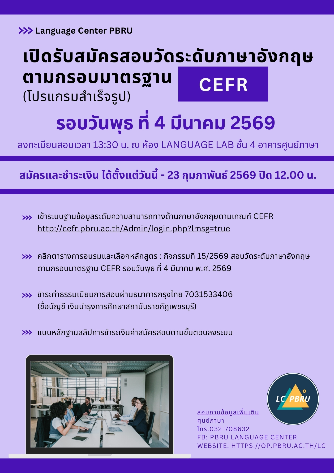 เปิดรับสมัคร กิจกรรมที่ 15/2569 สอบวัดระดับภาษาอังกฤษตามกรอบมาตรฐาน CEFR รอบวันพุธ ที่ 4 มีนาคม พ.ศ. 2569
